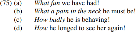 Although we have so far concentrated on interrogative clauses, there are a number of other types of wh-clause found in English. One of these are exclamative clauses like: