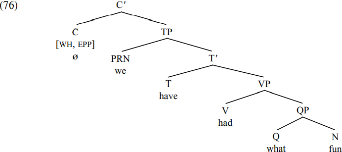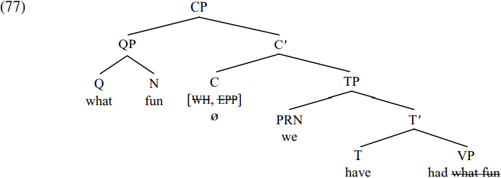 The [WH] feature of C attracts the closest maximal projection with a wh-word (i.e. the QP what fun) and moves it into spec-CP, simultaneously deleting the [WH, EPP] features on C. The resulting derived structure is that shown in simplified form below: