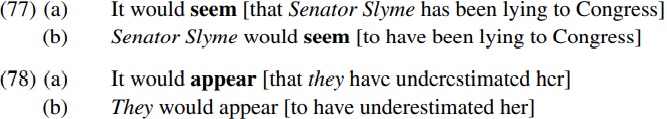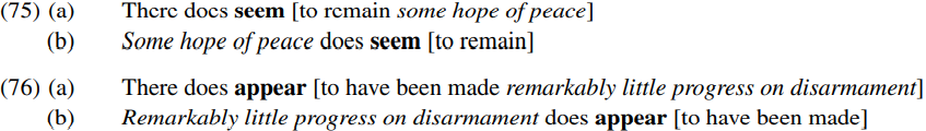 In (75), the italicized expression some hope of peace is the thematic complement of the unaccusative predicate remain; it remains in situ in the expletive structure (75a), but raises to become the subject of the seem-clause in (75b). In (76), the italicized expression remarkably little progress on disarmament is the thematic complement of the passive verb made; it remains in situ in the expletive structure (76a) but raises to become the subject of the appear-clause in (76b). In (77), the italicized expression Senator Slyme is the thematic subject of the verb lying: if the complement clause is a finite clause as in (77a), it surfaces as the subject of the complement clause; but if the complement clause is infinitival as in (77b), it surfaces as the subject of the seem clause. Likewise, in (78), the italicized pronoun they is the thematic subject of the verb underestimate: if the complement clause is finite as in (78a), it surfaces as the subject of the complement clause; if the complement clause is infinitival as in (78b), it surfaces as the subject of the appear clause.