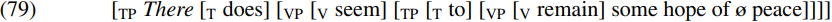 Examples like (75)–(78) suggest that verbs like seem and appear resemble passive predicates in that they allow an expression which is a theta-marked argument of a predicate in a lower clause to raise to become the subject of the seem/appear clause. Given this assumption, a sentence such as (75b) will have the following simplified derivation. At the point where the QP some hope of ø peace has been formed (the noun peace having been merged with a null quantifier), it will be merged with (and θ-marked by) the verb remain to form the VP remain some hope of ø peace. This VP is then merged with the infinitival tense particle to to form the TP to remain some hope of ø peace. The resulting infinitival TP is subsequently merged with the verb seem to form the VP seem to remain some hope of ø peace. This in turn is merged with the finite tense auxiliary DO to form the T-bar does seem to remain some hope of ø peace. A finite T has an [EPP] feature requiring it to have a subject; one way of satisfying this requirement is to merge expletive there with the resulting T-bar, to form the TP shown in simplified form in (79) below:
