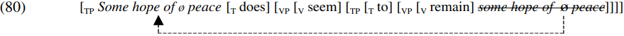An alternative way of satisfying the [EPP] feature of [T does] is to move the closest nominal c-commanded by does (= the QP some hope of ø peace) from being the thematic complement of remain to becoming the structural subject of does, as shown in simplified form in (80) below: