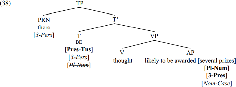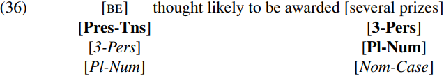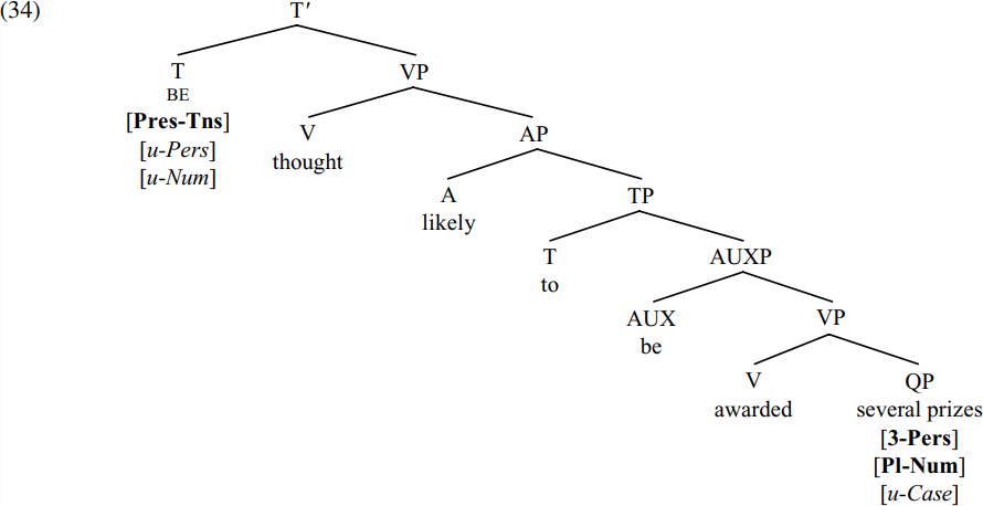 -features), BE serves as a probe which searches for a nominal goal within the structure containing it. The nominal several prizes can serve as a goal for the probe BE, since several prizes is active by virtue of carrying an uninterpretable case feature. By application of Feature-Copying (7), the unvalued person and number features on BE are given the same values as those on several prizes – as shown in simplified form in (35) below: