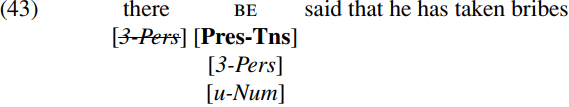 However, the resulting derivation will ultimately crash, for two reasons. Firstly, the number feature on BE has remained unvalued, and the PF component cannot process unvalued features. And secondly, the uninterpretable person and number features on be have not been deleted, and the semantic component cannot process uninterpretable features. In other words, our assumptions about the differences between expletive it and expletive there allow us to provide a principled account of why (40a) It is said that he has taken bribes is grammatical, but (40b) ∗There is said that he has taken bribes is not.