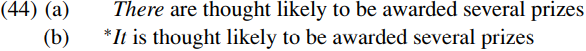 It follows from (45) that in structures like (34) where [T BE] c-commands (and agrees in person and number with) an indefinite nominal (several prizes), expletive there can be used but not expletive it, so deriving (44a) There are thought likely to be awarded several prizes. Conversely in structures like (19) where there is no matching goal accessible to the probe [T BE], it can be used but not there – so deriving (18a) It is said that he has taken bribes. It also follows from (45) that neither expletive can be used in structures like the following: