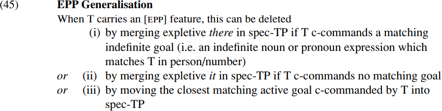 So, we see that the EPP Generalization in (45) provides a descriptively adequate characterization of data like (40), (44), (46) and (47). (See Bowers 2002 for an alternative account of the there/it distinction in expletives.)