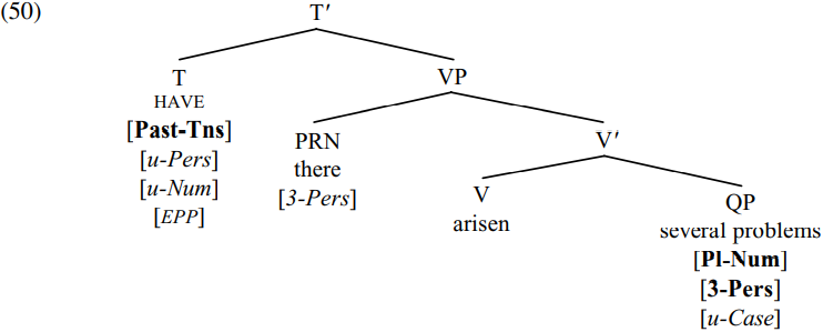 [T HAVE] will then probe for active matching goals which carry person and/or number features, and locates two such active goals, there and several problems. Accordingly, T simultaneously agrees with both there and several problems – resulting in multiple agreement (i.e. agreement between a probe and more than one matching goal). Clearly, this will only yield a successful outcome if the associate carries the same third-person feature as there – thereby accounting for the observation by Sigurðsson (1996) that expletive associates must be third-person expressions. The [EPP] feature of T simultaneously attracts the closest active goal, so triggering movement of there to spec-TP. We can assume that all the various operations affecting a given probe (like T in (50) above) apply simultaneously, so that agreement with there, agreement with several problems and movement of there to spec-TP all apply at the same time.
