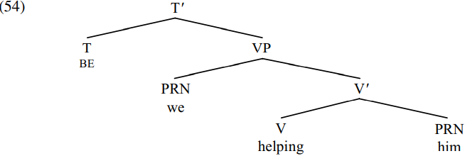 Given the assumptions we are making here, (53) will be derived as follows. The verb helping merges with its THEME complement him to form the V-bar helping him. This V-bar is in turn merged with its AGENT argument we to form the VP we helping him. The resulting VP is then merged with a present-tense T constituent to form the T-bar shown in simplified form in (54) below: