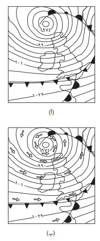 شكل 2-1 (أ) خريطة طقس تبين خطوط الأيزوبار الخاصة بالضغط؛ (ب) خريطة تبين أيضًا متجهات الرياح السرعة.