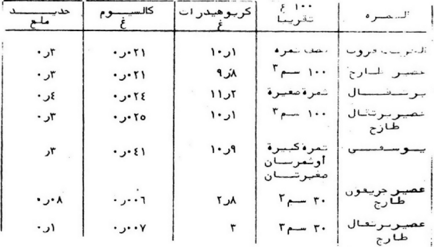 والجدول التالي يبين مقارنة بين ثمار الحمضيات وعصيرها خاصة الكربوهيدرات والعناصر المعدنية والفيتامينات.