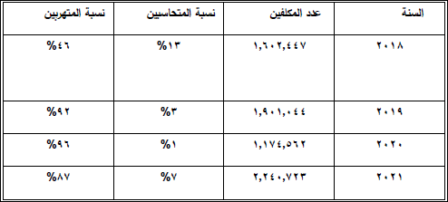 جدول رقم (1)(8) يبين عدد المكلفين و المتحاسبين والمكلفين المتهربين للسنوات ( 2018 – 2021)