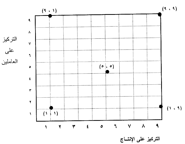 لقد صنف بليك وموتون (BLACK & MOUTON) الأسلوب القيادي إلى خمس مجموعات رئيسية اعتماداً على بعدين أساسين هما: التركيز على الإنتاج والتركيز على العاملين وقد عبر بليك وموتون عن هذه الأساليب بالأرقام التالية (1،1)، (9،1)، (1،9)، (5,5)، (9,9)، وهي منسوبة إلى البعد الأفقي وهو الاهتمام بالإنتاج والبعد الرأسي وهو التركيز على العاملين (شكل 1) .