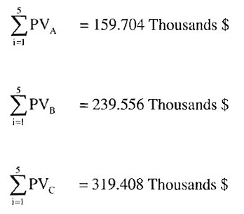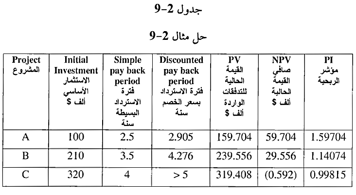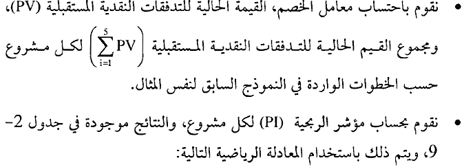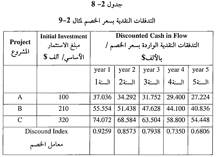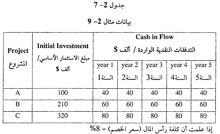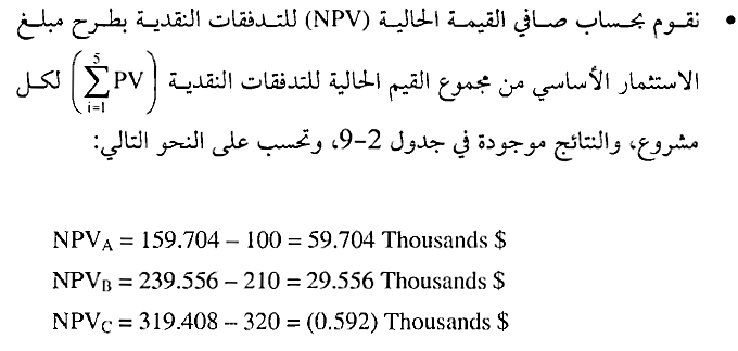• حساب مجموع القيم الحالية للتدفقات النقدية لكل مشروع من المشاريع في السنوات الخمس والنتائج موجودة في جدول ، 2ـــــ9 ، وتحسب على النحو التالي :