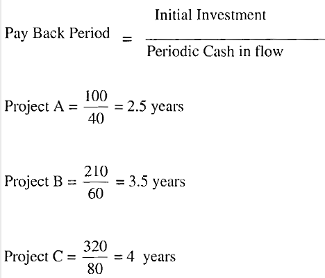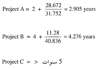 مشروع C = أكثر من 5 سنوات، وذلك لأننا إذا جمعنا التدفقات النقدية بسعر الخصم للسنوات الخمس فإن مجموعها = 319.408 ألف $، وهو أقل من مبلغ الاستثمار الأساسي 320 ألف $ ولهذا نقول أن فترة الاسترداد بسعر الخصم أكبر من 5 سنوات.