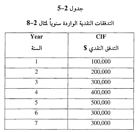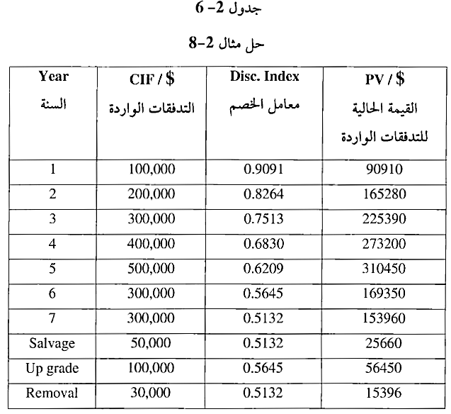 • حساب القيمة الحالية (PV) للتدفقات النقدية بعد إخضاعها لسعر الخصم وذلك كما تم في الفرع السابق لنفس المثال. والنتائج موجودة في جدول 2ــــــ8 .