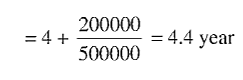 يتم جمع التدفقات النقدية الواردة حتى نصل إلى مبلغ الاستثمار الأساسي 1,200,000 ونحسب عدد السنوات التي تحقق فيها ذلك. فتكون هي فترة الاسترداد البسيطة. ومن الجدول نلاحظ أن مجموع التدفقات في السنوات الأربعة الأولى = $1000,000. يبقى بعد ذلك $200,000، إذاً عدد السنوات لاسترداد رأس المال