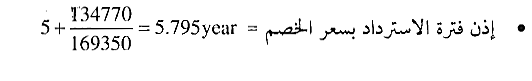 • بعدها نقوم بجمع PV حتى نسترد قيمة الاستثمار ونحسب عدد السنوات التي يتم فيها ذلك، فتكون هي فترة الاسترداد مع الخصم وفي سؤالنا يكون مجموع التدفقات المخصومة (PV) حتى نهاية السنة الخامسة = 1,065,230$ وبطرح هذه القيمة من مبلغ الاستثمار الأساسي 1,200,000$ يكون المبلغ المتبقي = $134770.