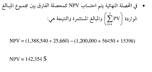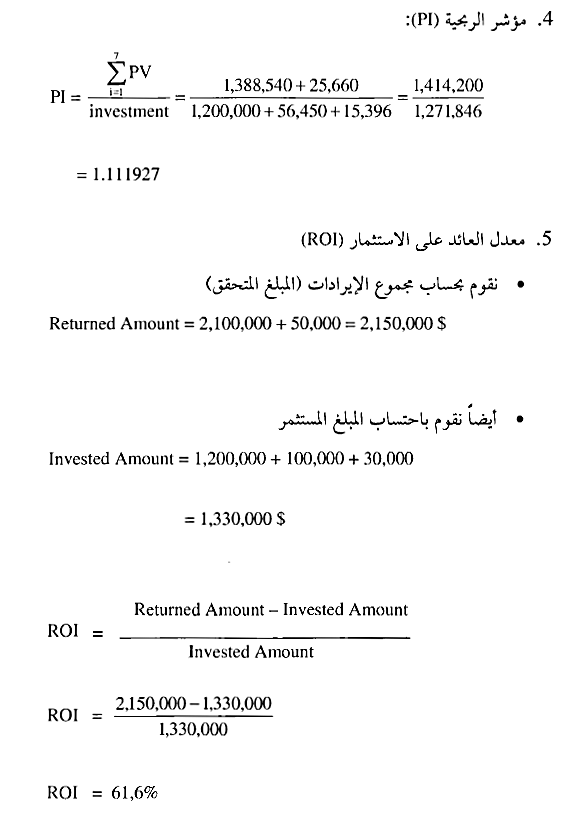 بما أن NPV موجبة وتساوي 142,354 وأن مؤشر الربحية PI أكبر من 1 ويساوي 1.111927 وأن العائد على الاستثمار ROI يساوي 61.6 % وهـو مرتفع. إذن نقوم باختيار المشروع للتنفيذ، وانصح شركة عالم البلاستيك بتنفيذ المشروع.