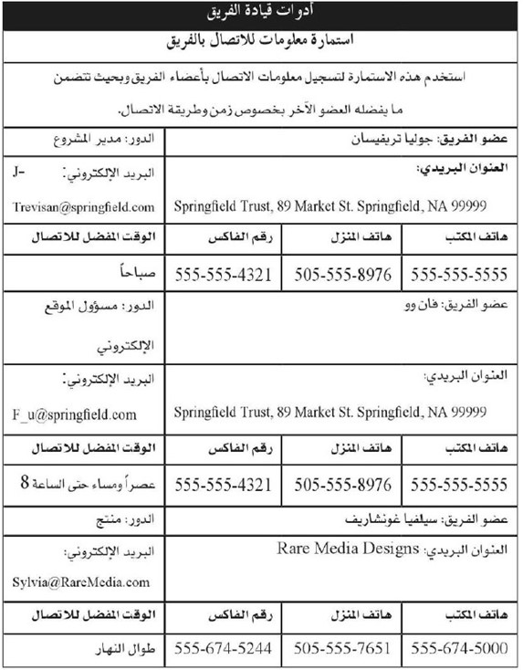 يوجد في الصفحة الآتية أنموذج لاستمارة المعلومات للاتصال بالفريق.