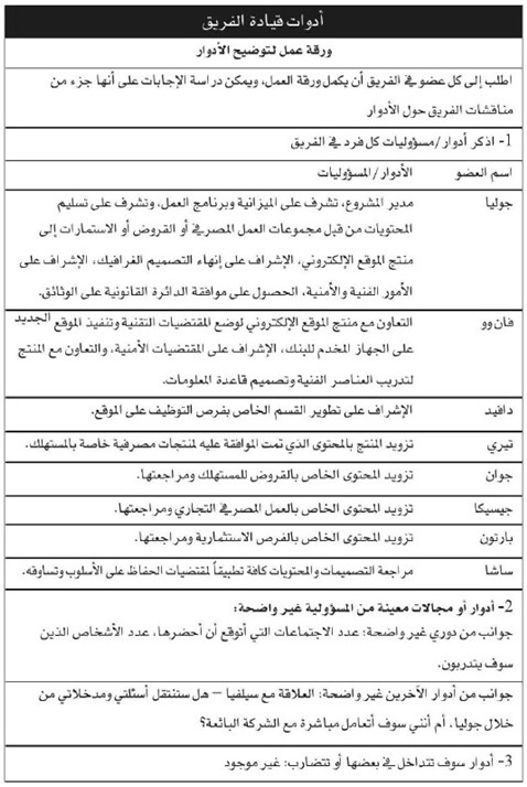 احرص على وضوح الأدوار والمسؤوليات. كل فرد في الفريق بحاجة لمعرفة سبب وجوده في الفريق، وأن يعرف أيضاً أسباب وجود الآخرين وما دور كل واحد منهم وما يجعلهم جميعاً فريقاً واحداً. من الوسائل المساعدة في الكشف عن الأخطاء في التقدير أن نستخدم أداة «ورقة عمل لتوضيح الأدوار». فعندما تقرأ كيف يرى عضو في الفريق واجبات ومواضع الأعضاء الآخرين تبرز أمامك الأشياء التي ينبغي لك توضيحها وإعادة التأكيد عليها أو تعديلها.