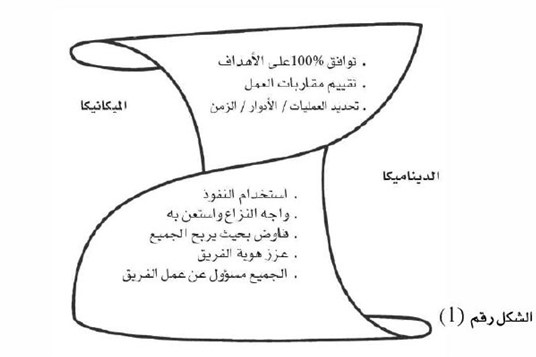 إن الفريق عالي الأداء ينفذ ويطبق أسس العمل الفريقي ويدير الدينامية بتدبر وروية. فالعلوم الأساسية للميكانيكا والديناميكا، مثلها مثل وجهي الشريط لا ينفصلان عن بعضهما ويشكلان جزأين متلازمين للعمل الفريقي الجيد. انظر الشكل رقم (1).