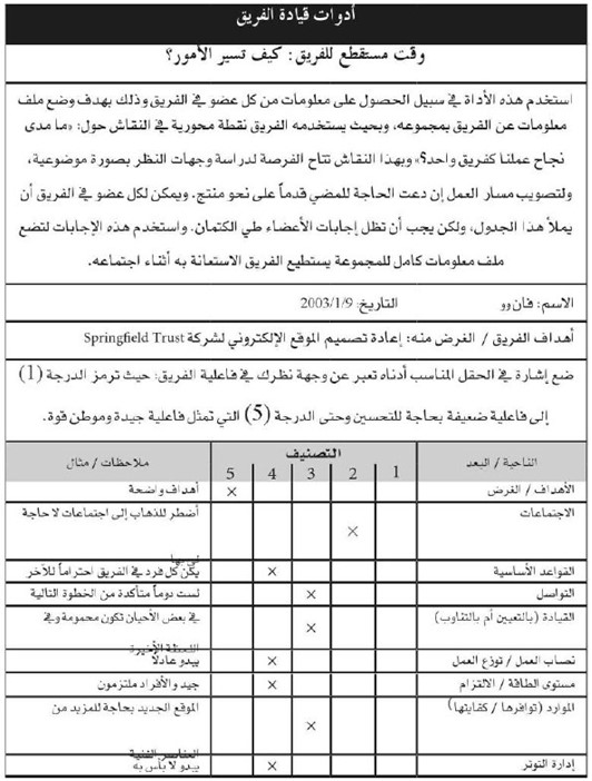 استعن بالأداة الآتية لجمع معلومات من أعضاء الفريق كافة حول طريقة عمل الفريق بمجموعه. بهذه الأداة تتمكن من معرفة المشكلات في وقت مبكر فتناقشها مع الأعضاء لتجدوا السبل المناسبة لحل المشكلات أو تحسين المسار.