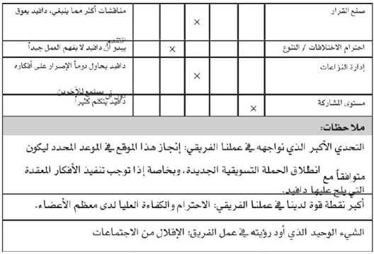 وعلى سبيل المثال، اطلب إلى الفريق ان يناقش ويتوصل بالتالي إلى توافق حول ما يأتي: