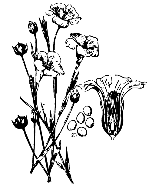 شكل يبين اجزاء من نبات الكتان: السيقان والاوراق والازهار والاجراس والبذور .