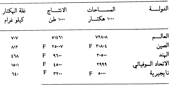 جدول ( 1 ) يبين المساحات والانتاج الكلي وغلة الهكتار للعالم والدول المشهورة بإنتاج الدخن لسنة 1976 (1976.F.A.O)