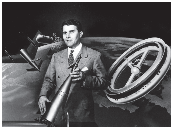 شكل: يقف مهندس الصواريخ الألماني الأمريكي فيرنر فون براون أمام لوحة تشيسلي بونستيل لمجلة «كوليير» في عام 1952، حاملاً نموذجًا للمُعزّز الخاص به، للإعلان عن حلقات والت ديزني التليفزيونية عن الفضاء 1955. بعد أن كان فون براون قائدا في برامج صواريخ الجيش الألماني والأمريكي، ثُم في وكالة ناسا، جعل نفسه أيضًا واحدًا من أهم مروجي المستقبلية الفلكية في أمريكا في الخمسينيات من القرن العشرين (المصدر: متحف الطيران والفضاء الوطني التابع لمؤسسة سميثسونيان).
