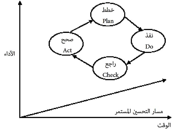 ويمكن توضيح دورة ديمنغ وعلاقتها بالتحسين المستمر في الشكل رقم (2) والمكونة من أربعة أنشطة يتم القيام بها بشكل دوري، على شكل دائرة دون أي توقف، وهي: