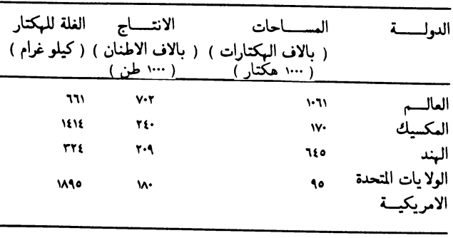 جدول يبين المساحات والانتاج الكلي للعالم وللدول العالمية المشهورة بإنتاج العصفر لسنة 1976 (1976 F.A.O)
