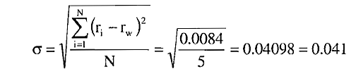 نقوم أولا بطرح قيمة rw من قيم ri لكل مشروع ونقوم بتربيع الناتج ثم نقوم يجمع الناتج ونقسمه على عدد المشاريع وهو 5 . تطبيقا للمعادلة 10—9