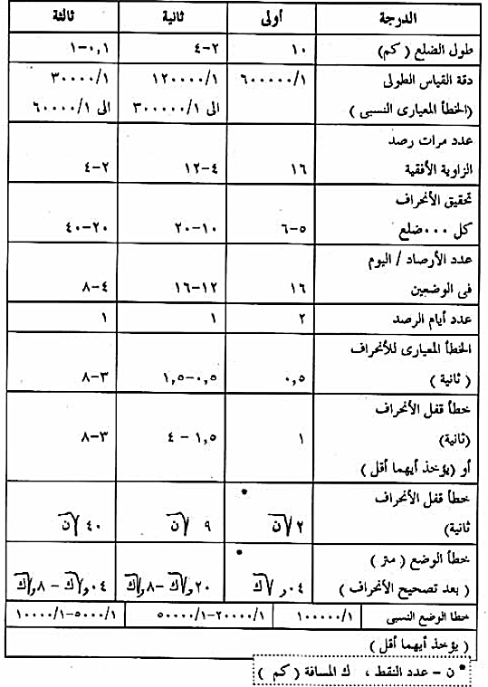 - ويجب الا تزيد المسافة بين النقط عن 2 كم في المناطق الصحراوية و 1.0 كم في المناطق الحضرية . ودقة هذه النقط هى دقة النقط الجيوديسية ، ولكنها لا تقل عن الحدود الموضحة في جدول (2) كما تثبت أيضا روبيرات عن طريق أعمال الميزانية تبدأ من الروبيرات الأساسية المثبتة بمعرفة الهيئة العامة للمساحة . ويجب الا يزيد فرق المنسوب بين روبيرين متتالين عن 100 متر .