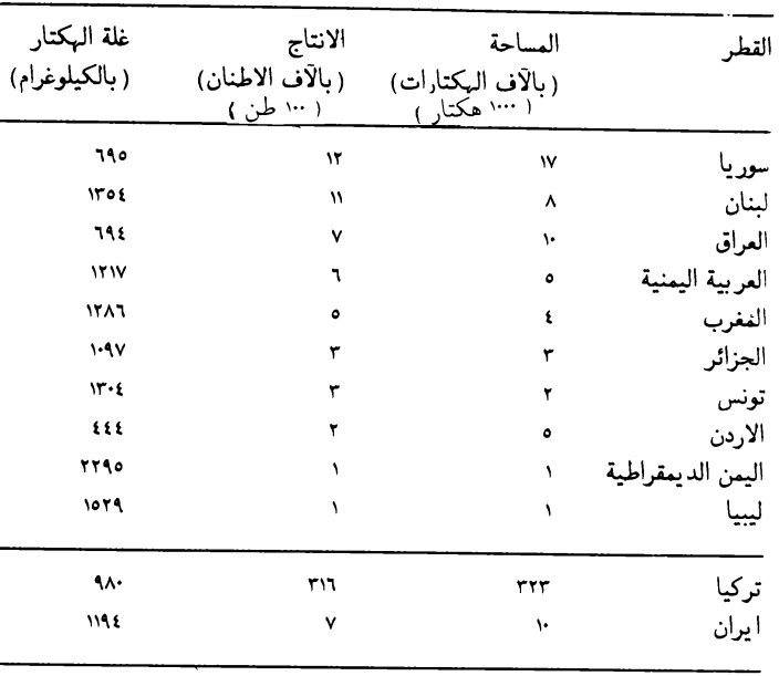 جدول يبين المساحات المزروعة بالتبغ والانتاج الكلي وغلة الهكتار للأقطار العربية والدول المجاورة للعراق حسب احصائية سنة 1976 ( 1976 .0.F.A ) .