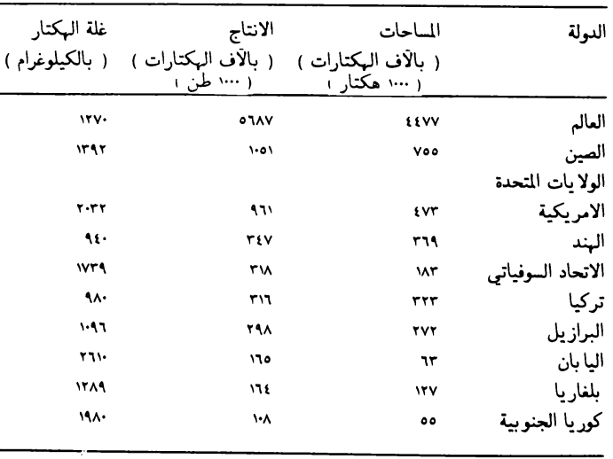 جدول يبين المساحات المزروعة بالتبغ والانتاج الكلي وغلة الهكتار للعالم وللدول المشهورة بإنتاجه حسب احصائية سنة 1976 ( 1976 .O.F.A )