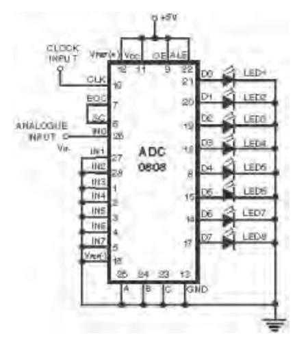 يبين الشكل التالي دارة لتحويل الإشارة التماثلية إلى رقمية باستخدام الرقاقة (ADC0808) التي تخرج 8 خانات ولها خطوط بيانات (DO-D7). وتعمل هذه الرقاقة حسب التقريب التتابعي (SuccessiveApproximation). يتم اختيار أحد المداخل عن طريق خطوط الاختيار (A,B,C). وفي هذا المثال تم اختيار المدخل IN عن طريق تأريض خطوط الاختيار (A,B,C). عادة ربط إشارات التحكم EOC (نهاية التحويل) (البدء في التحويلSC (، ALE (تمكين العناوين) وOE (تمكين الخرج) مع معالج دقيق. ولكن في هذا المثال تعمل الدارة على إشارة دخل متصلة دون الحاجة إلى استخدام المعالج الدقيق. ولذلك يتم ربط الأطراف ALE وOE بمصدر التغذية (+5V). أما طرف إشارة التحكم في الدخل SC فيتم وصله مع الطرف EOC للبدء في عملية التحويل.