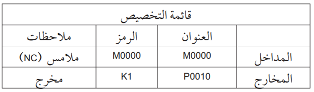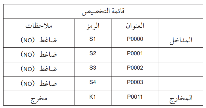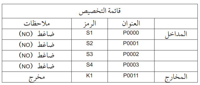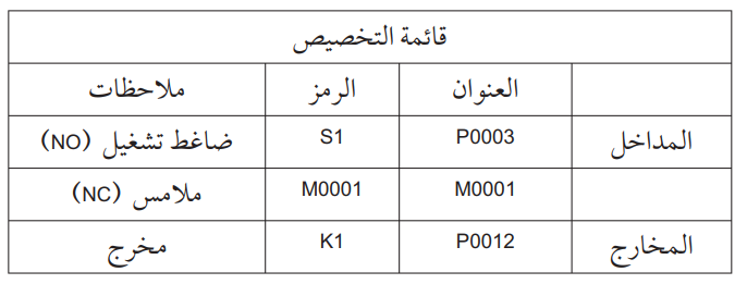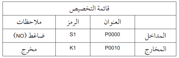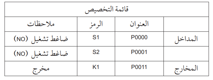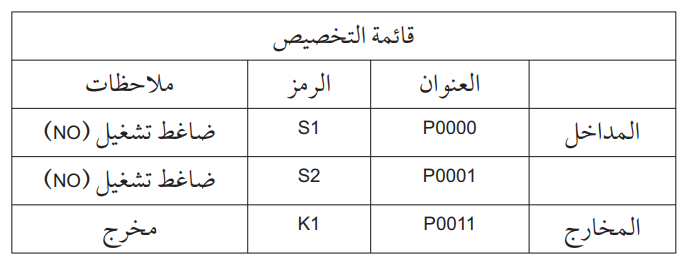من أجل برمجة المتحكم المنطقي المبرمج للتحكم بالعمليات الصناعية يجب تعيين عنوان معين لكل من المداخل والمخارج. وهذا العنوان مخصص من صانع الجهاز ويجب الالتزام به في عمليات البرمجة. ولهذا ومن أجل تسهيل عملية البرمجة يتم كتابة قائمة التخصيص (Assignment List) التي تحدد عنوان كل من المداخل والمخارج التي تم اختيارها التي سيتم اعتمادها خلال عملية البرمجة للجهاز المراد التحكم به.