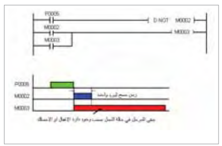 وهذه الوظيفة موجودة في كثير من المتحكمات المنطقية. وهي تعطي إمكانية تشغيل أحد المخارج أو المرحلات الداخلية لدورة عمل واحدة (زمن مسح واحد للبرنامج) وذلك عند الطرف الصاعد أو الطرف الهابط لإشارة الدخل. ويبين المخطط التالي عمل وكيفية برمجة عملية الشوط الواحد عند الطرف الصاعد لإشارة الدخل، الشكل (34).
