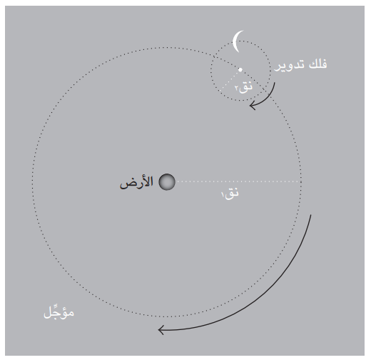 يصور فلك التدوير البسيط المبين هنا القمر. كلتا الدورتين يجب أن تكونا دوائر تامة الاستدارة. وهذا الرسم يهدف لتحقيق أغراض تعليمية ليس إلا. أضاف كلٌّ من بطليموس وكوبرنيكوس تعقيدات إلى أوصافهما للمدار القمري. (مقياس الرسم غير حقيقي.)