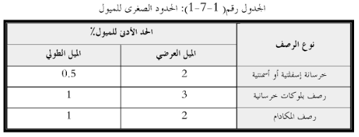 يجب على المقاول انهاء كافة الطبقات السطحية للطرق والشوارع وكافة عناصرها مثل الارصفة والجزر، طبقا للميول الطولية والعرضية المبينة في المخططات والمواصفات الخاصة و/او المحددة من قبل المهندس والتي تسمح بتصريف المياه وتوجيهها باتجاه فتحات التصريف او المصائد او المصارف الجانبية، ويجب ان تتوافق قيم الميول مع نوع طبقات الرصف المستخدمة، كما يجب ان تكون كافة سطوح طبقات الرصف والسطح العلوي لطبقة القاعدة مستوية وخالية من الانخفاضات والتموجات التي تعيق صرف المياه وتؤدي الى تجمعها ويجب على المقاول العناية بتحقيق الاستواء والميول المحددة بدءًا من طبقة القاعدة وما يليها، كما يجب الا تقل قيم الميول الطولية والعرضية الصغرى عن القيم المبينة في الجدول رقم ( 1-7-1)، ما لم تنص المخططات والمواصفات الخاصة على خلاف ذلك.