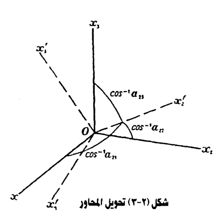 والمقصود من هذا المصطلح التحول من مجموعة من المحاور المتعامدة إلى مجموعة أخرى تشترك معها في نقطة الأصل وتكون وحدة القياس في اتجاه أي محور هي دائما نفس الوحدة. هب أننا أشرنا إلى المجموعة الأولى بالرموز x1، x2، x3 وإلى الثانية بالرموزx'1 ، x'2، x'3 الشكل (2-3) فإن العلاقة بين المجموعتين يمكن أن تكتب بدلالة جيوب تمام زوايا الاتجاهات.