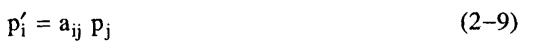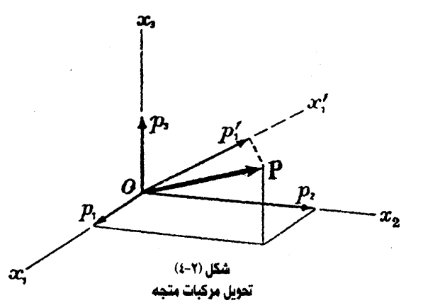 تعتبر إحداثيات النقطة (x3, x2, x1) بالنسبة للمحاور Ox3, Ox2, Ox1 هي مركبات المتجه OP في الشكل 2-4؛ ولذلك تكون الإحداثيات (x'3, x'2, x'1) بالنسبة للمحاور Ox'3, Ox'2, Ox'1 معطاة بالمعادلة: