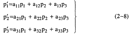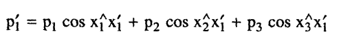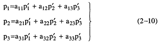 وأن مركباته في اتجاه المحاور x3, x2, x1 هي p3, p2, p1 (الشكل 2-4) وأن مركباته في اتجاه مجموعة أخرى من المحاور x'1 ، x'2، x'3 هي: p'1 ، p'2، p'3