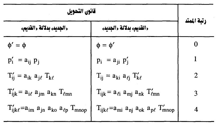 ومن ثم فإن قانون تحويل الممتد من الرتبة الثانية هو نفس قانون تحويل حاصل ضرب إحداثيين؛ أي أن مركبات كمية ممتدة Tij تتحول مثلما يتحول حاصل الضرب xixj. ويبين الجدول التالي (جدول2-2) قوانين تحويل مركبات كميات ممتدة من رتب مختلفة.