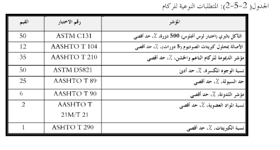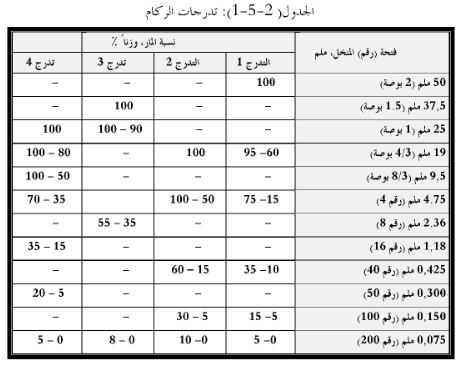 يجب ان تحقق المواد المراد معالجتها احد التدرجات الواردة في الجدول رقم( 1-5-2) او اي تدرج اخر يرد في المواصفات الخاصة او يثبت بالاختبار امكانية الحصول على خلطة تحقق المتطلبات التصميمية باستخدامه، كما يجب ان يحقق الركام المستخدم المتطلبات النوعية المبينة في الجدول (2-5-2) ما لم يرد خلاف ذلك في المواصفات الخاصة.