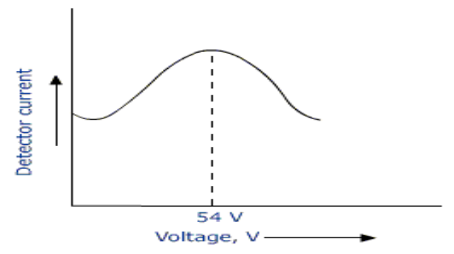 العلاقة بين شدة الاشعاع I وفرق الجهد V، حيث تكون القيمة العظمى للشدة عند 54 = V أو 50º = θ.