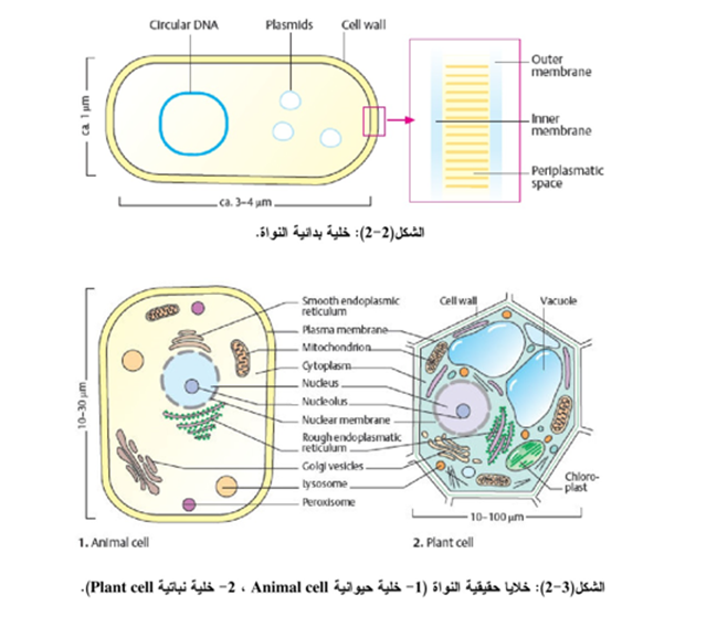 إن الخلايا بشكل عام تقسم الى بدائية النواة Prokaryotes (الشكل 2-2) (التراكيب الداخلية متميزة داخل أغشية خاصة بها كالمادة النووية، مثل خلايا البكتيريا والطحالب الخضراء- المزرقة) وحقيقية النواة Eukaryotes (التراكيب الداخلية متميزة كل داخل غشاء معين وتشمل أنواع الخلايا الأخرى كافة الشكل (3-2).