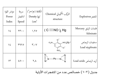1. المتفجرات الاولية primary explosive تتسم بأنها مركبات غيرثابتة unstableوذات حساسية عالية يمكن أن تنفجر بسهولة عند تعرضها لصدمة أو حرارة أو شرارة وتتراوح سرعة انفجارها بين 1000-5500م/ث . ومن الامثلة عليها : فلمنات الزئبق وأزيد الرصاص وستفينات الرصاص كما في جدول (3-1) (1)