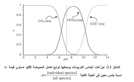 المنطوية على أن المنظومة الطبيعية المعنية موجودة في حالة توازن ترموديناميكي. يمكننا الخط العمودي في الشكل 2.1 عند القيمة 7 = pH من تقدير نسب الأجناس عند تلك القيمة. يمثّل ثاني أكسيد الكربون المائي نحو 16% من جميع أجناس الكربونات، وتمثل كربونات الهدروجين 84 ، في حين أن نسبة الكربونات ضئيلة جداً.