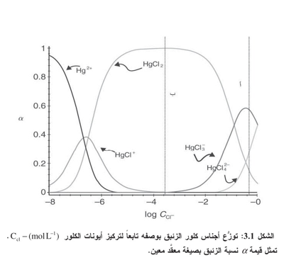 يشير الخط العمودي (أ) في الشكل 3.1 إلى المحيطات التي تحتوي على تركيز كلي للكلور يساوي1- L mol 0.56. وتُري المنحنيات أن الـ -2 4HgCl يمثل 28% من أجناس الزئبق، ويمثل HgCl %56 ، ويمثل HgCl %16. ويوافق الخط (ب) ماء بئر تركيز أيونات الكلور فيه يساوي ppm 9.5حيث الجنس الوحيد المهيمن هو 2HgCl .